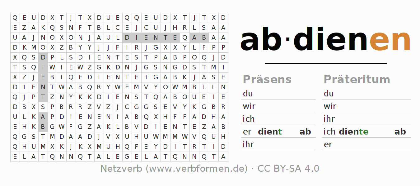 Suchsel, Suchworträtsel für alle Formen des Verbs abdienen