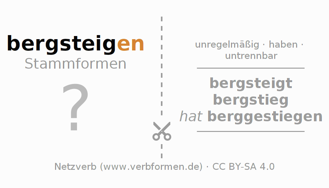Arbeitsblätter dienen dem Üben der Konjugation des Verbs bergsteigen im Unterricht und im Selbststudium. Die Materialien können im Rahmen der Lizenz CC BY-SA 4.0 als Open Educational Resources (OER) z. B. im Unterricht kostenlos genutzt werden. Dafür stehen viele verschiedene Typen von Arbeitsblättern für das Verb bergsteigen zur Verfügung. Das sind Konjugationstabellen, Rätsel und Spiele. Das gesamten Unterrichtsmaterial ist als PDF-Download, als Bilder und als interaktive Browser-Version gratis verfügbar. Neben den Aufgaben geben auch unzählige Beispiele für bergsteigen eine Hilfestellung zur Verwendung des Verbs.
