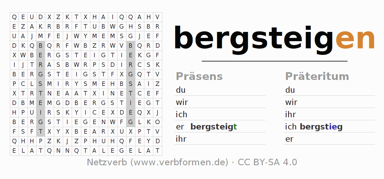 Mit diesen Wortsuchrätseln kann man auf herausfordernde Art und Weise die Konjugation des deutschen Verbs bergsteigen erlernen.