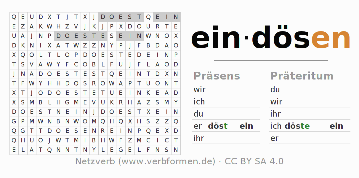 Suchsel, Suchworträtsel für alle Formen des Verbs eindösen