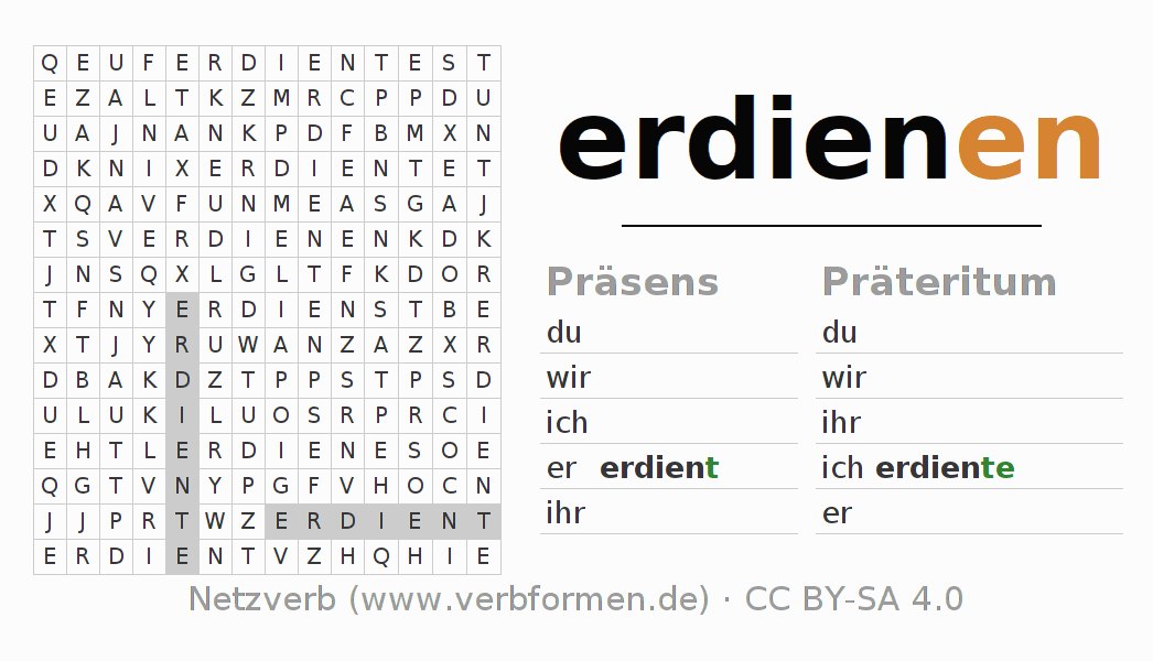 Suchsel, Suchworträtsel für alle Formen des Verbs erdienen
