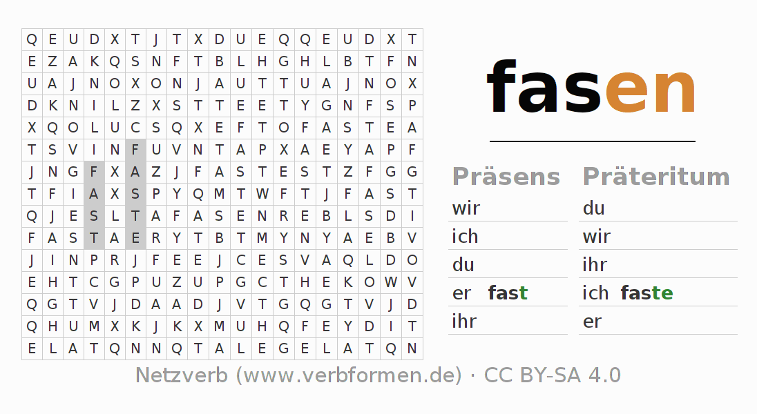 Suchsel, Suchworträtsel für alle Formen des Verbs fasen
