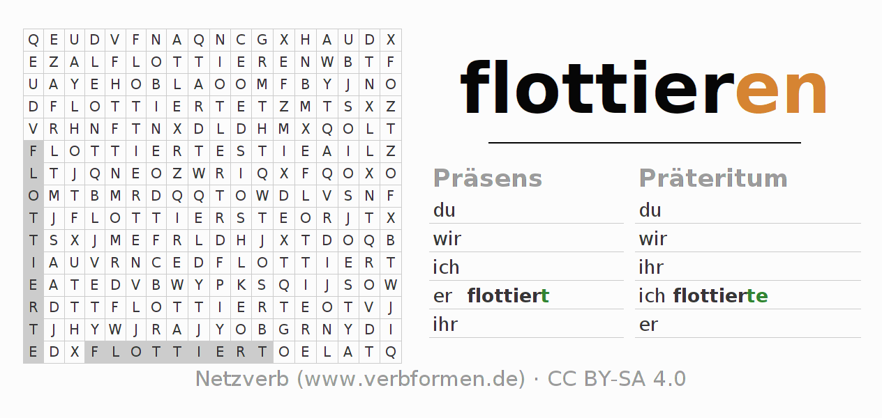 Mit diesen Wortsuchrätseln kann man auf herausfordernde Art und Weise die Konjugation des deutschen Verbs flottieren erlernen.