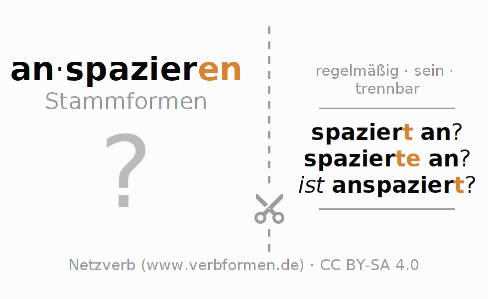 Arbeitsblätter dienen dem Üben der Konjugation des Verbs anspazieren im Unterricht und im Selbststudium. Die Materialien können im Rahmen der Lizenz CC BY-SA 4.0 als Open Educational Resources (OER) z. B. im Unterricht kostenlos genutzt werden. Dafür stehen viele verschiedene Typen von Arbeitsblättern für das Verb anspazieren zur Verfügung. Das sind Konjugationstabellen, Rätsel und Spiele. Das gesamten Unterrichtsmaterial ist als PDF-Download, als Bilder und als interaktive Browser-Version gratis verfügbar. Neben den Aufgaben geben auch unzählige Beispiele für anspazieren eine Hilfestellung zur Verwendung des Verbs.