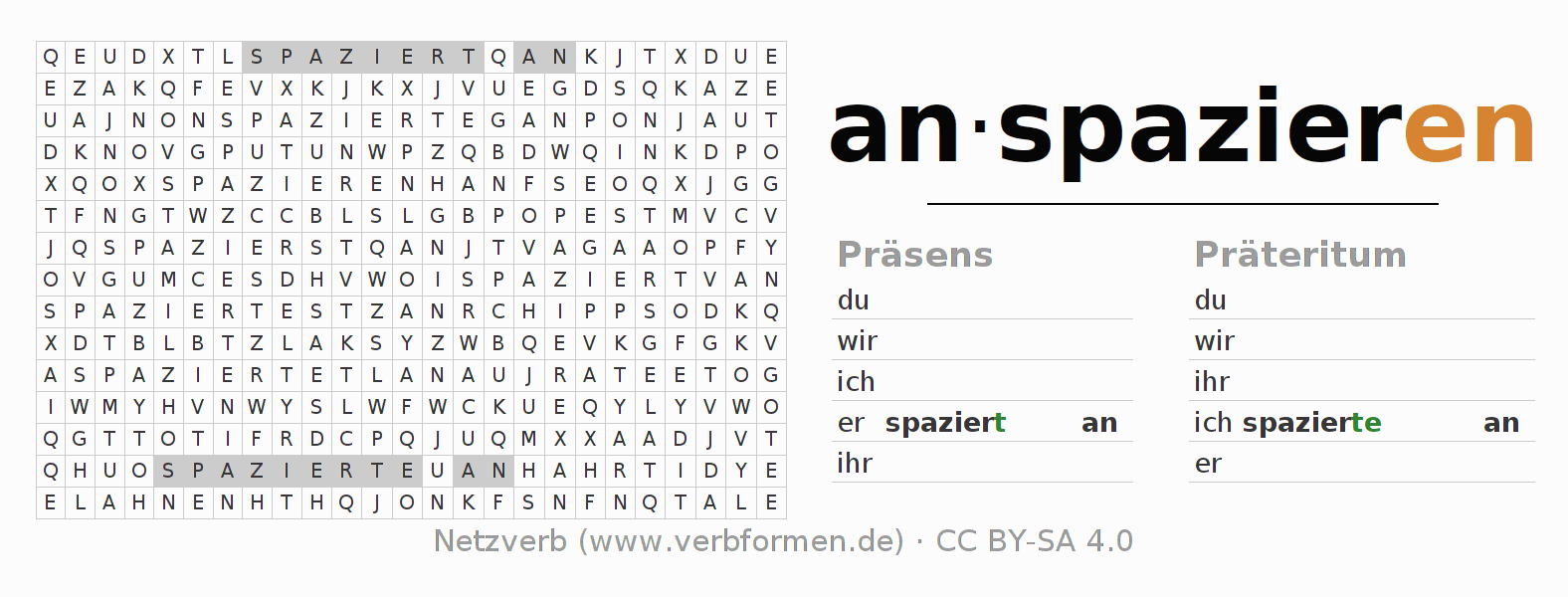 Suchsel, Suchworträtsel für alle Formen des Verbs anspazieren