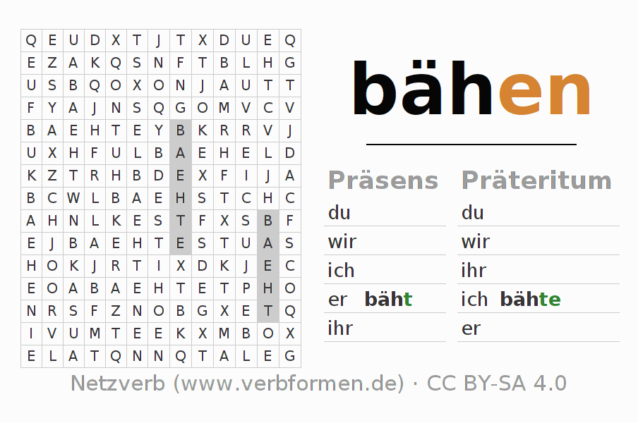 Suchsel, Suchworträtsel für alle Formen des Verbs bähen