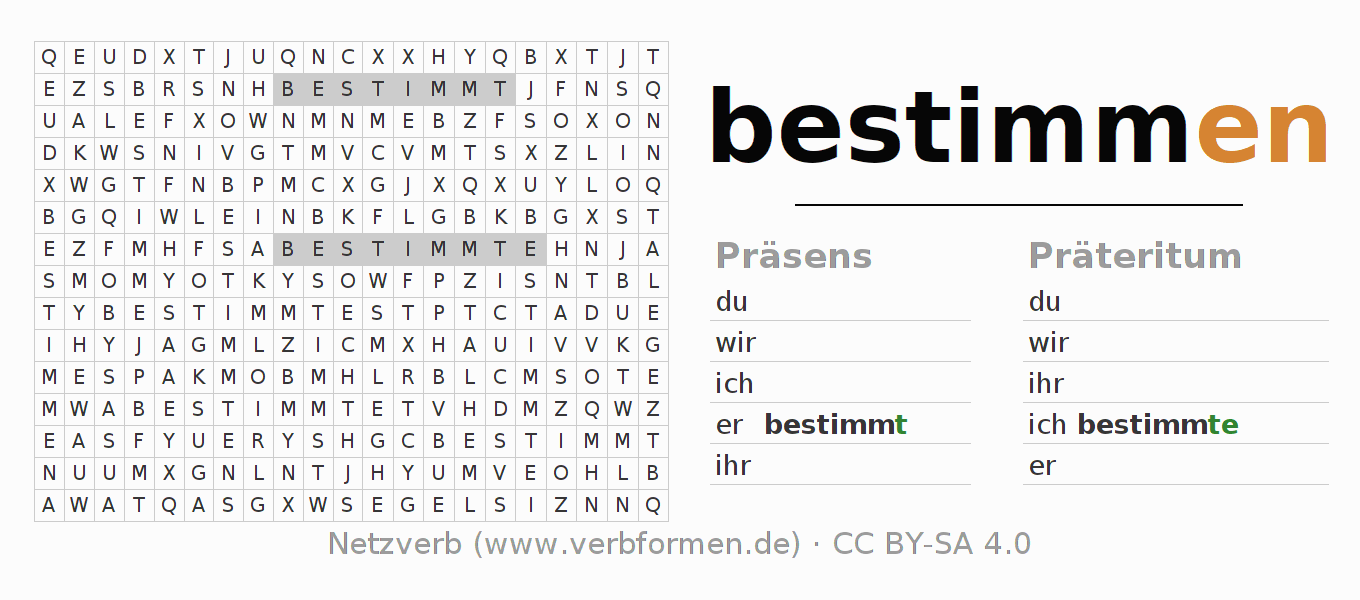 Arbeitsblätter dienen dem Üben der Konjugation des Verbs bestimmen im Unterricht und im Selbststudium. Die Materialien können im Rahmen der Lizenz CC BY-SA 4.0 als Open Educational Resources (OER) z. B. im Unterricht kostenlos genutzt werden. Dafür stehen viele verschiedene Typen von Arbeitsblättern für das Verb bestimmen zur Verfügung. Das sind Konjugationstabellen, Rätsel und Spiele. Das gesamten Unterrichtsmaterial ist als PDF-Download, als Bilder und als interaktive Browser-Version gratis verfügbar. Neben den Aufgaben geben auch unzählige Beispiele für bestimmen eine Hilfestellung zur Verwendung des Verbs.