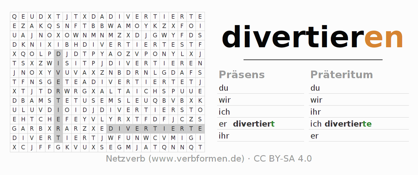 Mit diesen Wortsuchrätseln kann man auf herausfordernde Art und Weise die Konjugation des deutschen Verbs divertieren erlernen.