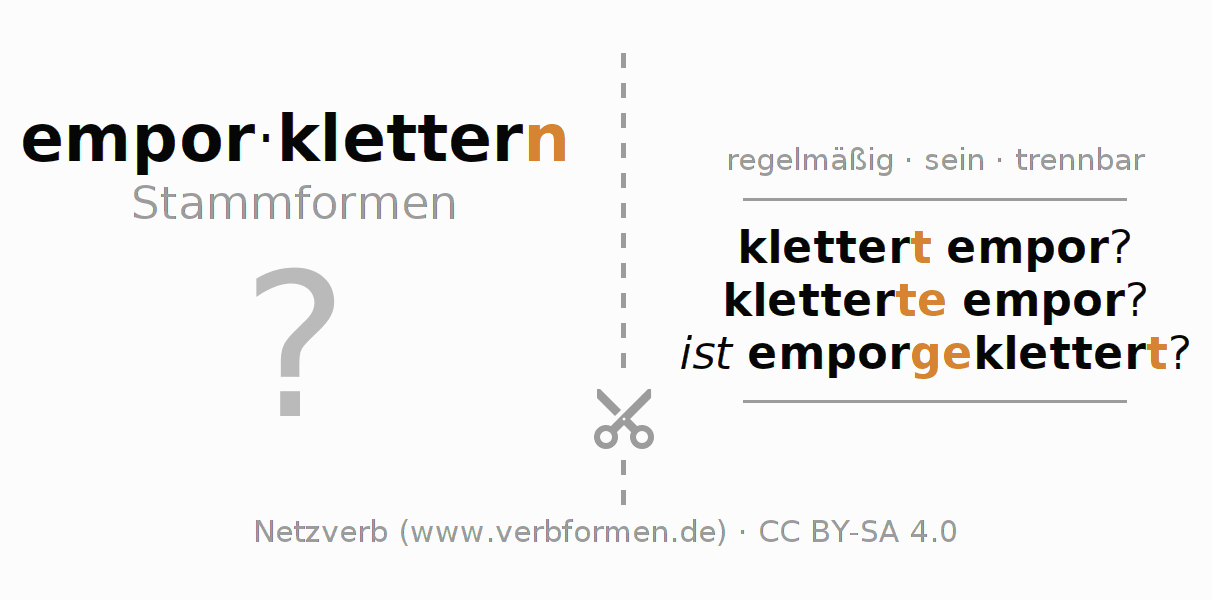 Arbeitsblätter dienen dem Üben der Konjugation des Verbs emporklettern im Unterricht und im Selbststudium. Die Materialien können im Rahmen der Lizenz CC BY-SA 4.0 als Open Educational Resources (OER) z. B. im Unterricht kostenlos genutzt werden. Dafür stehen viele verschiedene Typen von Arbeitsblättern für das Verb emporklettern zur Verfügung. Das sind Konjugationstabellen, Rätsel und Spiele. Das gesamten Unterrichtsmaterial ist als PDF-Download, als Bilder und als interaktive Browser-Version gratis verfügbar. Neben den Aufgaben geben auch unzählige Beispiele für emporklettern eine Hilfestellung zur Verwendung des Verbs.
