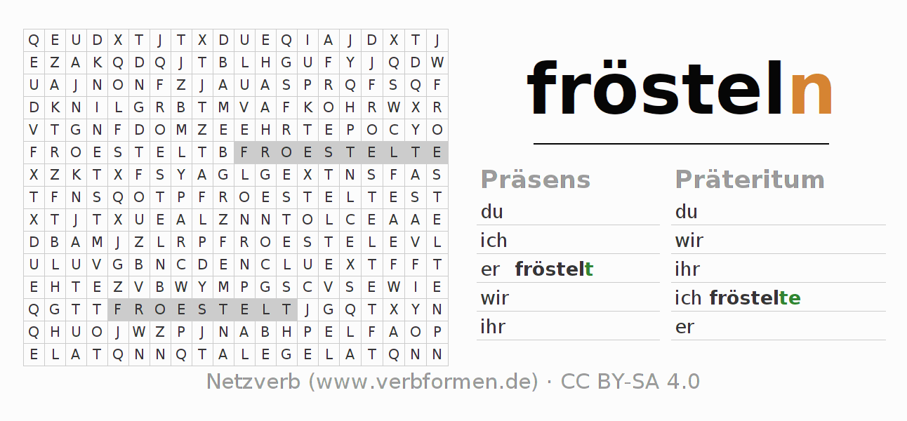 Mit diesen Wortsuchrätseln kann man auf herausfordernde Art und Weise die Konjugation des deutschen Verbs frösteln erlernen.