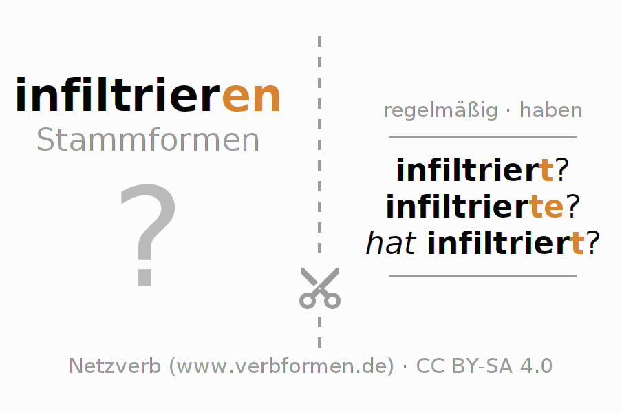 Arbeitsblätter dienen dem Üben der Konjugation des Verbs infiltrieren im Unterricht und im Selbststudium. Die Materialien können im Rahmen der Lizenz CC BY-SA 4.0 als Open Educational Resources (OER) z. B. im Unterricht kostenlos genutzt werden. Dafür stehen viele verschiedene Typen von Arbeitsblättern für das Verb infiltrieren zur Verfügung. Das sind Konjugationstabellen, Rätsel und Spiele. Das gesamten Unterrichtsmaterial ist als PDF-Download, als Bilder und als interaktive Browser-Version gratis verfügbar. Neben den Aufgaben geben auch unzählige Beispiele für infiltrieren eine Hilfestellung zur Verwendung des Verbs.