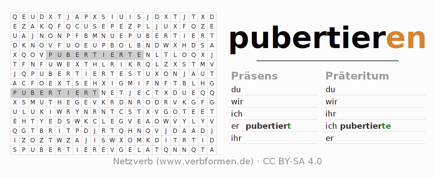 Suchsel, Suchworträtsel für alle Formen des Verbs pubertieren