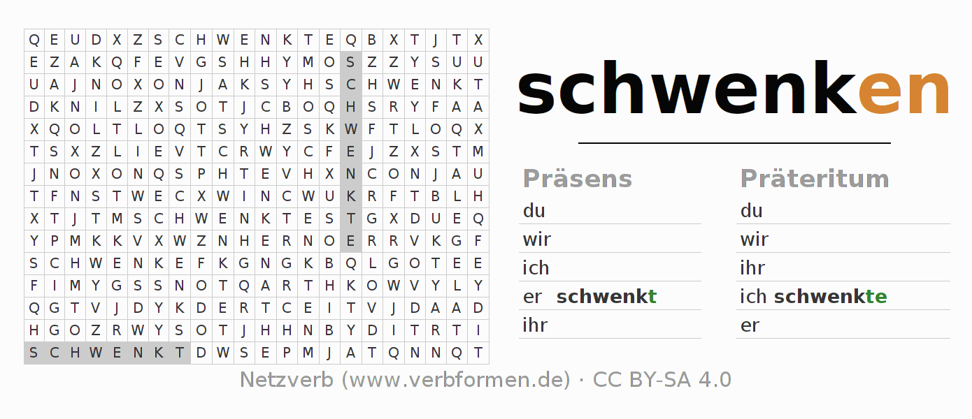 Mit diesen Wortsuchrätseln kann man auf herausfordernde Art und Weise die Konjugation des deutschen Verbs schwenken erlernen.