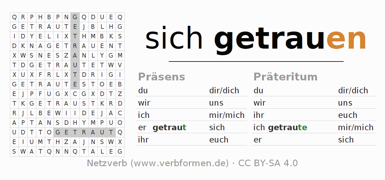Arbeitsblätter dienen dem Üben der Konjugation des Verbs getrauen im Unterricht und im Selbststudium. Die Materialien können im Rahmen der Lizenz CC BY-SA 4.0 als Open Educational Resources (OER) z. B. im Unterricht kostenlos genutzt werden. Dafür stehen viele verschiedene Typen von Arbeitsblättern für das Verb sich getrauen zur Verfügung. Das sind Konjugationstabellen, Rätsel und Spiele. Das gesamten Unterrichtsmaterial ist als PDF-Download, als Bilder und als interaktive Browser-Version gratis verfügbar. Neben den Aufgaben geben auch unzählige Beispiele für getrauen eine Hilfestellung zur Verwendung des Verbs.