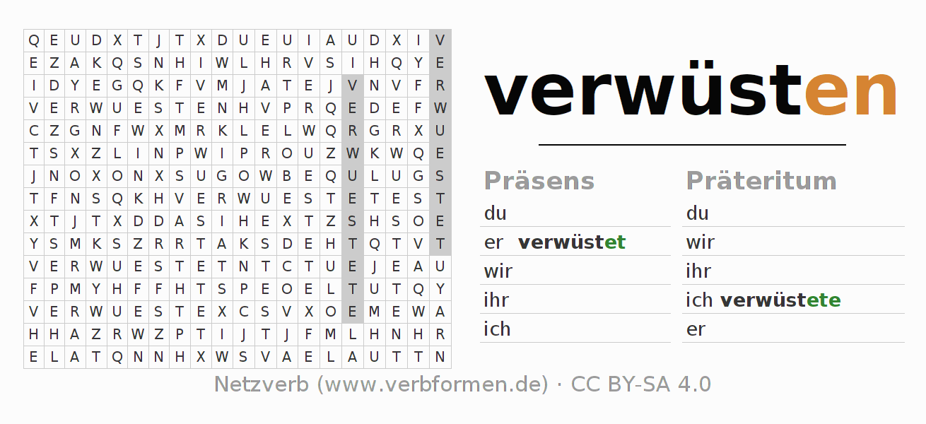 Suchsel, Suchworträtsel für alle Formen des Verbs verwüsten