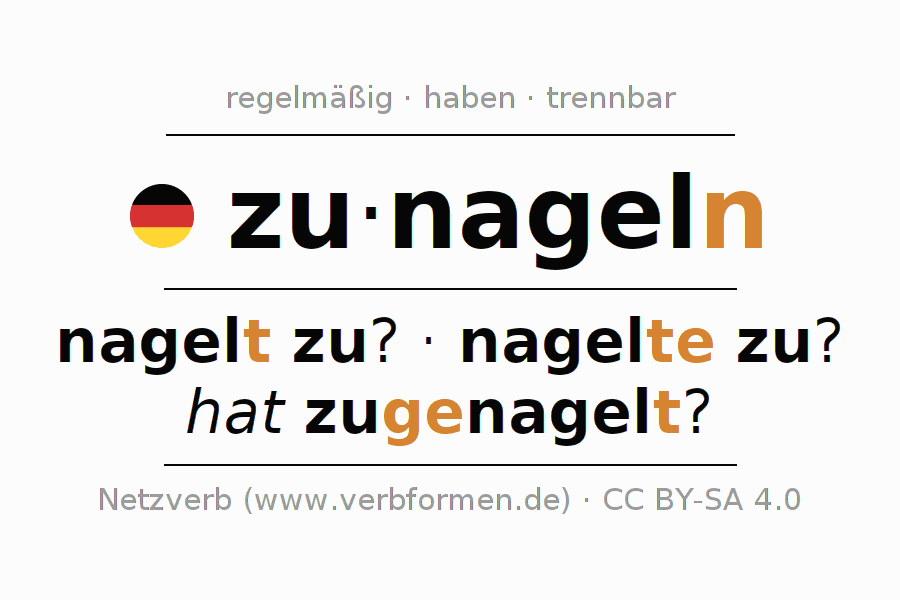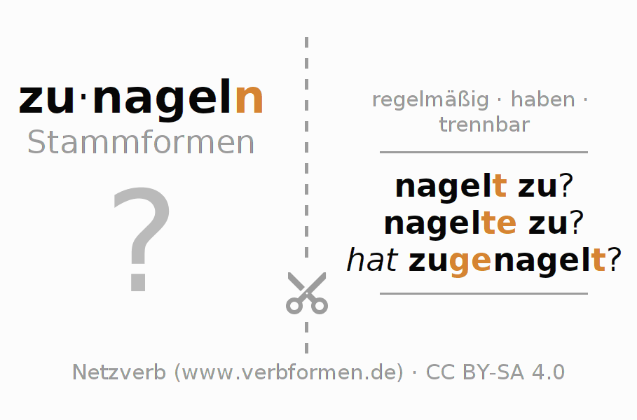 Arbeitsblätter dienen dem Üben der Konjugation des Verbs zunageln im Unterricht und im Selbststudium. Die Materialien können im Rahmen der Lizenz CC BY-SA 4.0 als Open Educational Resources (OER) z. B. im Unterricht kostenlos genutzt werden. Dafür stehen viele verschiedene Typen von Arbeitsblättern für das Verb zunageln zur Verfügung. Das sind Konjugationstabellen, Rätsel und Spiele. Das gesamten Unterrichtsmaterial ist als PDF-Download, als Bilder und als interaktive Browser-Version gratis verfügbar. Neben den Aufgaben geben auch unzählige Beispiele für zunageln eine Hilfestellung zur Verwendung des Verbs.