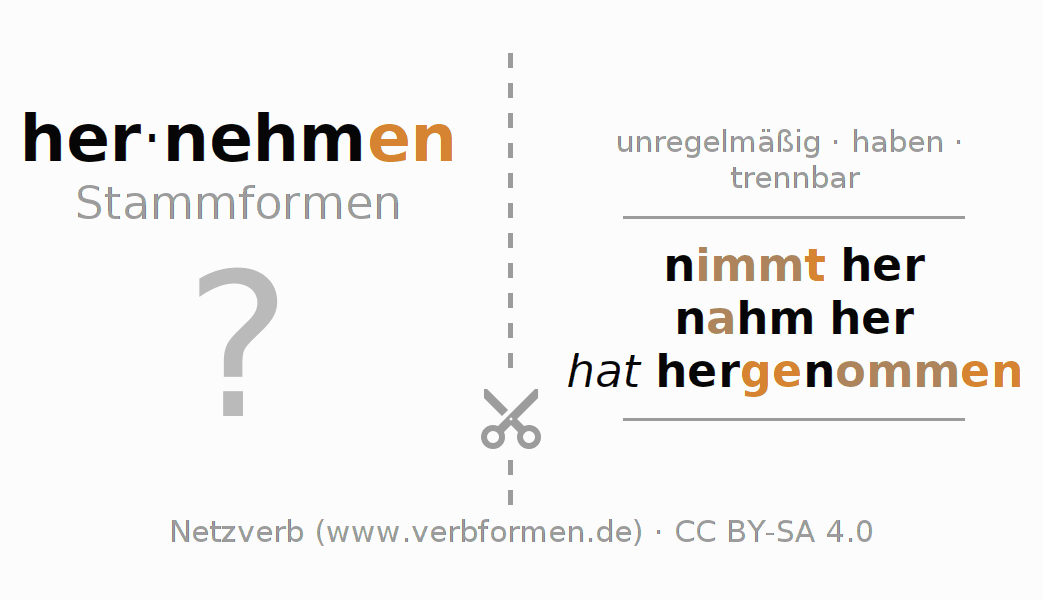 Arbeitsblätter dienen dem Üben der Konjugation des Verbs hernehmen im Unterricht und im Selbststudium. Die Materialien können im Rahmen der Lizenz CC BY-SA 4.0 als Open Educational Resources (OER) z. B. im Unterricht kostenlos genutzt werden. Dafür stehen viele verschiedene Typen von Arbeitsblättern für das Verb hernehmen zur Verfügung. Das sind Konjugationstabellen, Rätsel und Spiele. Das gesamten Unterrichtsmaterial ist als PDF-Download, als Bilder und als interaktive Browser-Version gratis verfügbar. Neben den Aufgaben geben auch unzählige Beispiele für hernehmen eine Hilfestellung zur Verwendung des Verbs.