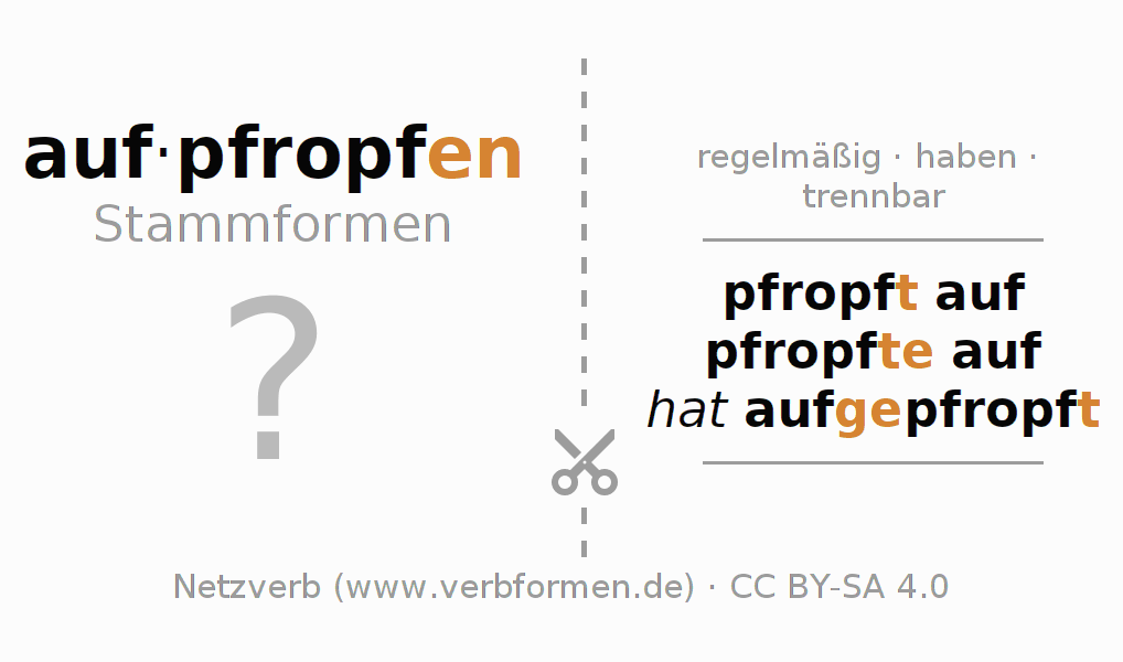 Anleitung: Die Lernkarten des Verbs aufpfropfen ausdrucken und ausschneiden. Danach die einzelnen Karten für mehrere Verben auf einen Stapel legen und mischen. Nun können die Karten der Reihe nach gezogen werden. Die Angaben auf den Karten müssen ohne Nachzulesen im Gedächtnis abgerufen werden. Zum Abgleich der eigenen Lösung nutzt man danach die Angaben auf den Lernzetteln.