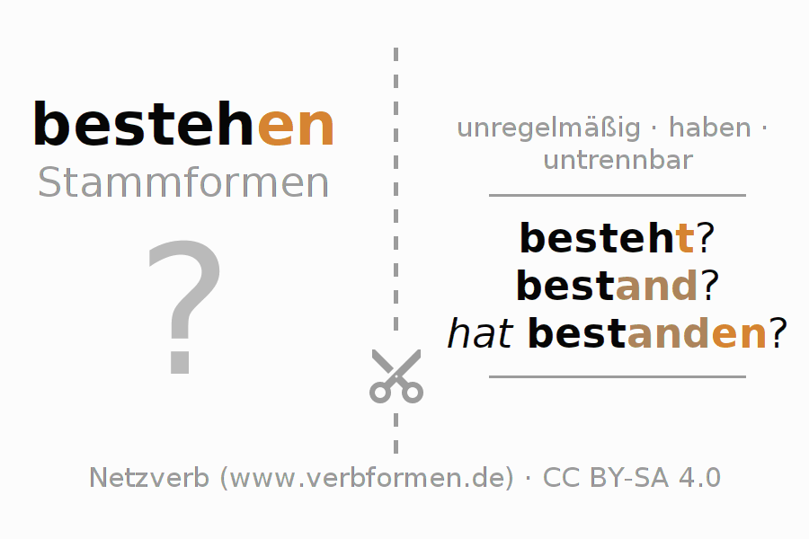 Mit den Lernkarten können die einzelnen Verbformen der deutschen Konjugation erlernt und trainiert werden. Dazu werden die Vorgaben auf den Lernzetteln für das Verb bestehen der Reihe nach bearbeitet. Die geforderten Verbformen müssen dazu im Kopf gebildet werden. Anschließend gleicht man diese mit den Hinweisen auf den Karteikarten ab. Bei Übereinstimmung bestätigt man sein Lernergebnis. Bei Abweichung kann man die Hinweise nutzen, um sich die unbekannten Formen einzuprägen. Idealerweise druck man die PDF-Datei der Lernkarten aus und faltet sie wie angegeben. So kann man sie auf einen Stapel mit anderen Verben zum Lernen nutzen. Es gibt auch noch viele weitere Arbeitsblätter für das Verb bestehen. Alle Materialien können als Open Educational Resources (OER) im Rahmen der Lizenz CC BY-SA 4.0 kostenlos und frei genutzt werden.