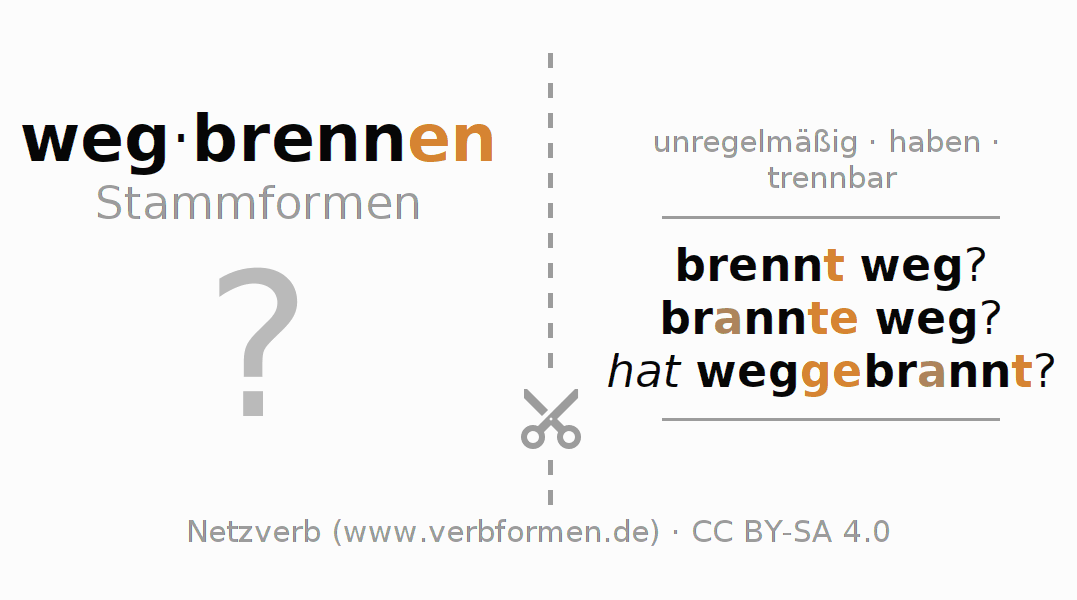 Anleitung: Die Lernkarten des Verbs wegbrennen ausdrucken und ausschneiden. Danach die einzelnen Karten für mehrere Verben auf einen Stapel legen und mischen. Nun können die Karten der Reihe nach gezogen werden. Die Angaben auf den Karten müssen ohne Nachzulesen im Gedächtnis abgerufen werden. Zum Abgleich der eigenen Lösung nutzt man danach die Angaben auf den Lernzetteln.
