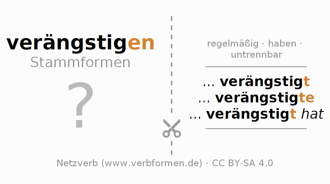Mit den Lernkarten können die einzelnen Verbformen der deutschen Konjugation erlernt und trainiert werden. Dazu werden die Vorgaben auf den Lernzetteln für das Verb verängstigen der Reihe nach bearbeitet. Die geforderten Verbformen müssen dazu im Kopf gebildet werden. Anschließend gleicht man diese mit den Hinweisen auf den Karteikarten ab. Bei Übereinstimmung bestätigt man sein Lernergebnis. Bei Abweichung kann man die Hinweise nutzen, um sich die unbekannten Formen einzuprägen. Idealerweise druck man die PDF-Datei der Lernkarten aus und faltet sie wie angegeben. So kann man sie auf einen Stapel mit anderen Verben zum Lernen nutzen. Es gibt auch noch viele weitere Arbeitsblätter für das Verb verängstigen. Alle Materialien können als Open Educational Resources (OER) im Rahmen der Lizenz CC BY-SA 4.0 kostenlos und frei genutzt werden.