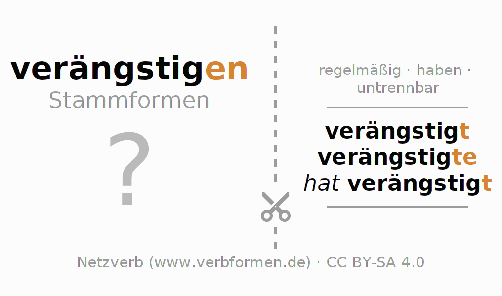 Mit den Lernkarten können die einzelnen Verbformen der deutschen Konjugation erlernt und trainiert werden. Dazu werden die Vorgaben auf den Lernzetteln für das Verb verängstigen der Reihe nach bearbeitet. Die geforderten Verbformen müssen dazu im Kopf gebildet werden. Anschließend gleicht man diese mit den Hinweisen auf den Karteikarten ab. Bei Übereinstimmung bestätigt man sein Lernergebnis. Bei Abweichung kann man die Hinweise nutzen, um sich die unbekannten Formen einzuprägen. Idealerweise druck man die PDF-Datei der Lernkarten aus und faltet sie wie angegeben. So kann man sie auf einen Stapel mit anderen Verben zum Lernen nutzen. Es gibt auch noch viele weitere Arbeitsblätter für das Verb verängstigen. Alle Materialien können als Open Educational Resources (OER) im Rahmen der Lizenz CC BY-SA 4.0 kostenlos und frei genutzt werden.