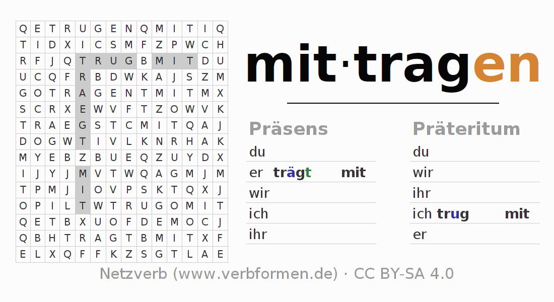Arbeitsblätter dienen dem Üben der Konjugation des Verbs mittragen im Unterricht und im Selbststudium. Die Materialien können im Rahmen der Lizenz CC BY-SA 4.0 als Open Educational Resources (OER) z. B. im Unterricht kostenlos genutzt werden. Dafür stehen viele verschiedene Typen von Arbeitsblättern für das Verb mittragen zur Verfügung. Das sind Konjugationstabellen, Rätsel und Spiele. Das gesamten Unterrichtsmaterial ist als PDF-Download, als Bilder und als interaktive Browser-Version gratis verfügbar. Neben den Aufgaben geben auch unzählige Beispiele für mittragen eine Hilfestellung zur Verwendung des Verbs.