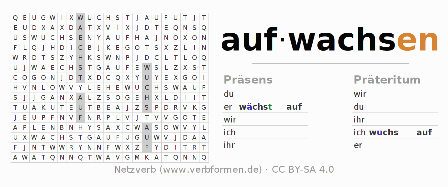 Arbeitsblätter dienen dem Üben der Konjugation des Verbs aufwachsen im Unterricht und im Selbststudium. Die Materialien können im Rahmen der Lizenz CC BY-SA 4.0 als Open Educational Resources (OER) z. B. im Unterricht kostenlos genutzt werden. Dafür stehen viele verschiedene Typen von Arbeitsblättern für das Verb aufwachsen zur Verfügung. Das sind Konjugationstabellen, Rätsel und Spiele. Das gesamten Unterrichtsmaterial ist als PDF-Download, als Bilder und als interaktive Browser-Version gratis verfügbar. Neben den Aufgaben geben auch unzählige Beispiele für aufwachsen eine Hilfestellung zur Verwendung des Verbs.