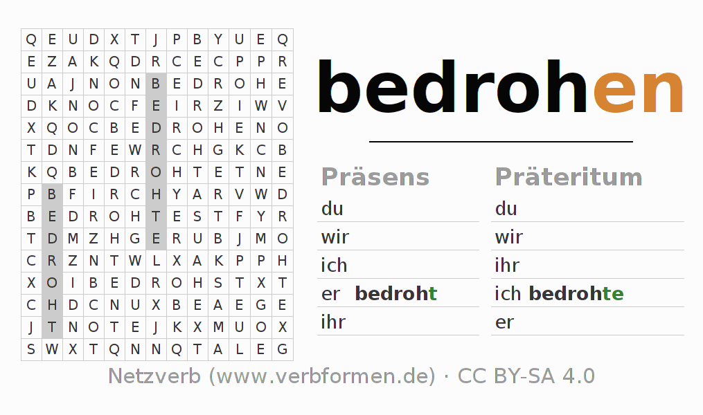 Mit diesen Wortsuchrätseln kann man auf herausfordernde Art und Weise die Konjugation des deutschen Verbs bedrohen erlernen.