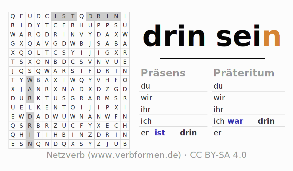 Suchsel, Suchworträtsel für alle Formen des Verbs drinsein