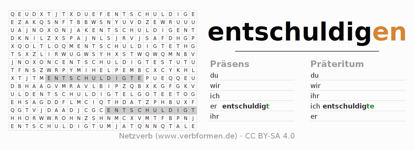 Suchsel, Suchworträtsel für alle Formen des Verbs entschuldigen