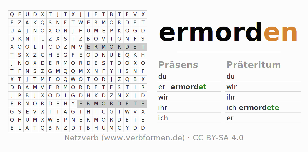 Mit diesen Wortsuchrätseln kann man auf herausfordernde Art und Weise die Konjugation des deutschen Verbs ermorden erlernen.