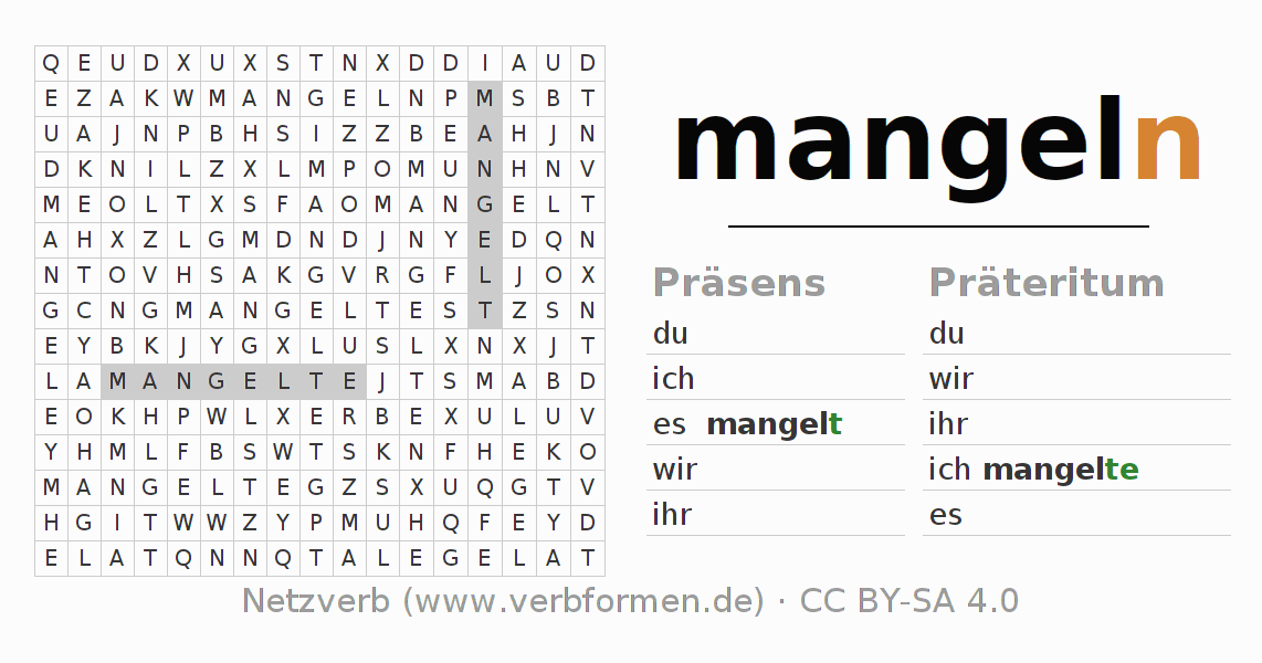 Mit diesen Wortsuchrätseln kann man auf herausfordernde Art und Weise die Konjugation des deutschen Verbs mangeln erlernen.