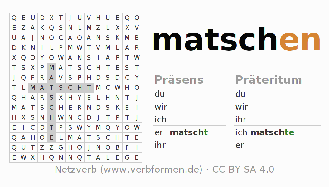 Mit diesen Wortsuchrätseln kann man auf herausfordernde Art und Weise die Konjugation des deutschen Verbs matschen erlernen.