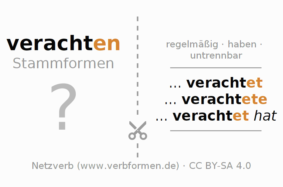 Arbeitsblätter dienen dem Üben der Konjugation des Verbs verachten im Unterricht und im Selbststudium. Die Materialien können im Rahmen der Lizenz CC BY-SA 4.0 als Open Educational Resources (OER) z. B. im Unterricht kostenlos genutzt werden. Dafür stehen viele verschiedene Typen von Arbeitsblättern für das Verb verachten zur Verfügung. Das sind Konjugationstabellen, Rätsel und Spiele. Das gesamten Unterrichtsmaterial ist als PDF-Download, als Bilder und als interaktive Browser-Version gratis verfügbar. Neben den Aufgaben geben auch unzählige Beispiele für verachten eine Hilfestellung zur Verwendung des Verbs.