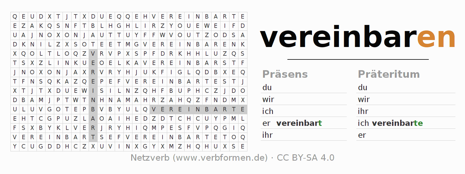 Suchsel, Suchworträtsel für alle Formen des Verbs vereinbaren