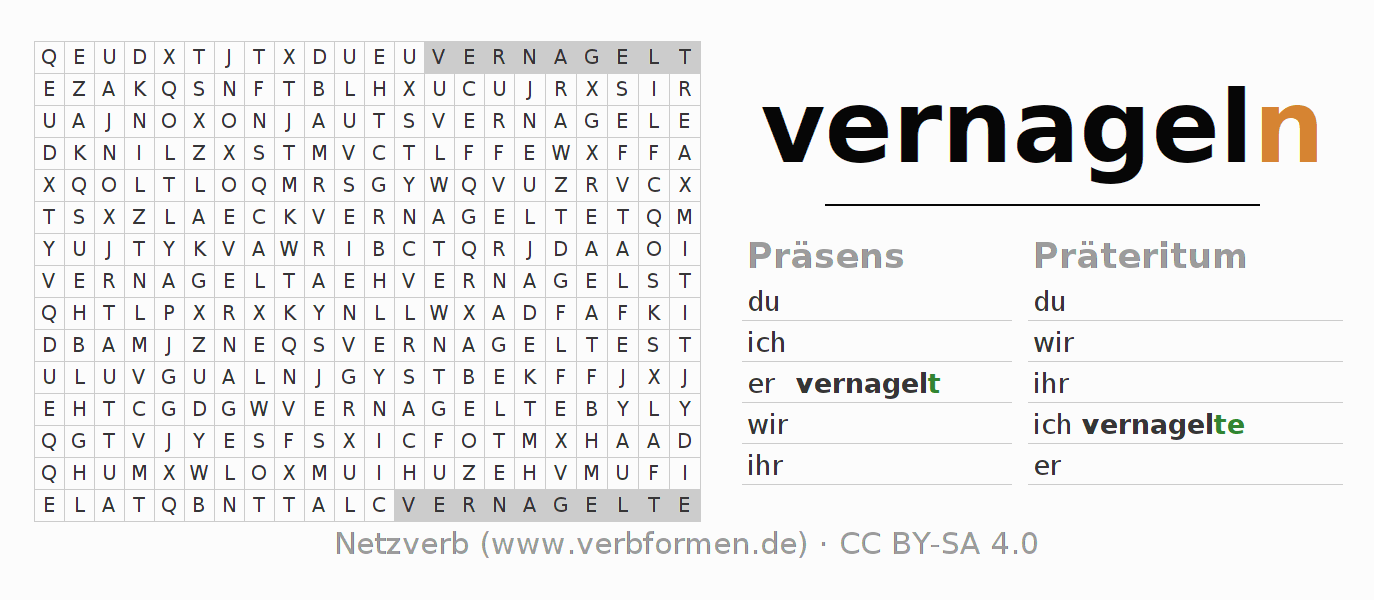 Mit diesen Wortsuchrätseln kann man auf herausfordernde Art und Weise die Konjugation des deutschen Verbs vernageln erlernen.
