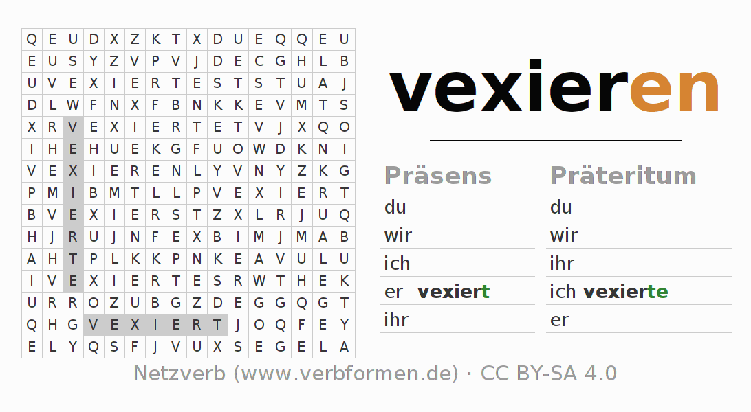 Mit diesen Wortsuchrätseln kann man auf herausfordernde Art und Weise die Konjugation des deutschen Verbs vexieren erlernen.