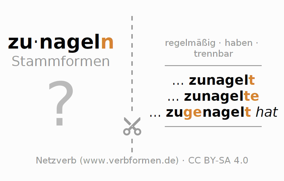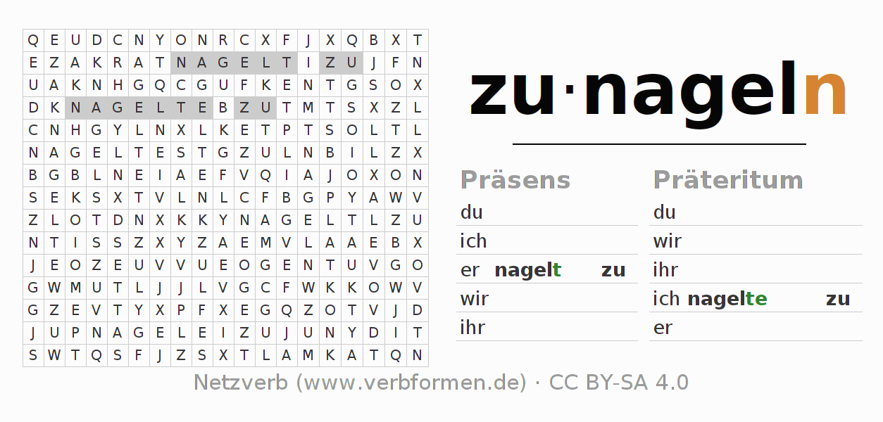 Arbeitsblätter dienen dem Üben der Konjugation des Verbs zunageln im Unterricht und im Selbststudium. Die Materialien können im Rahmen der Lizenz CC BY-SA 4.0 als Open Educational Resources (OER) z. B. im Unterricht kostenlos genutzt werden. Dafür stehen viele verschiedene Typen von Arbeitsblättern für das Verb zunageln zur Verfügung. Das sind Konjugationstabellen, Rätsel und Spiele. Das gesamten Unterrichtsmaterial ist als PDF-Download, als Bilder und als interaktive Browser-Version gratis verfügbar. Neben den Aufgaben geben auch unzählige Beispiele für zunageln eine Hilfestellung zur Verwendung des Verbs.