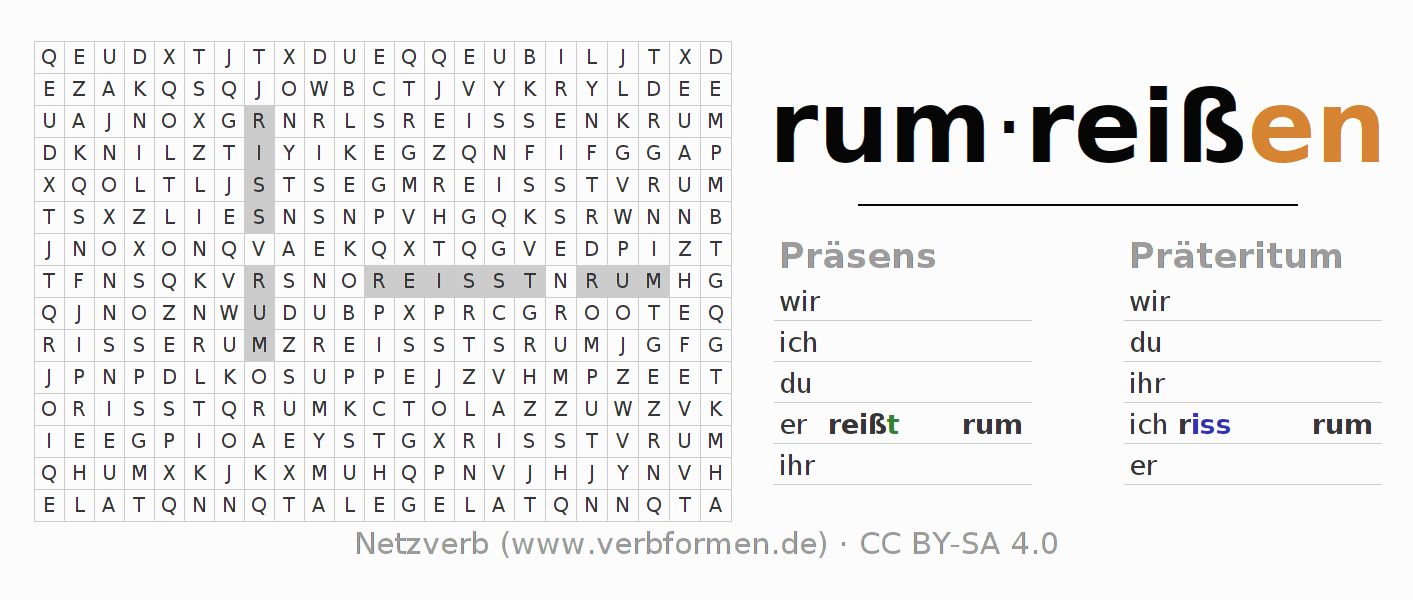Suchsel, Suchworträtsel für alle Formen des Verbs rumreißen