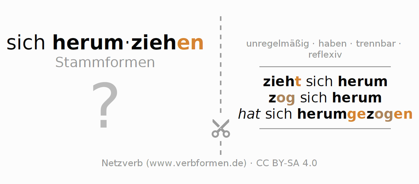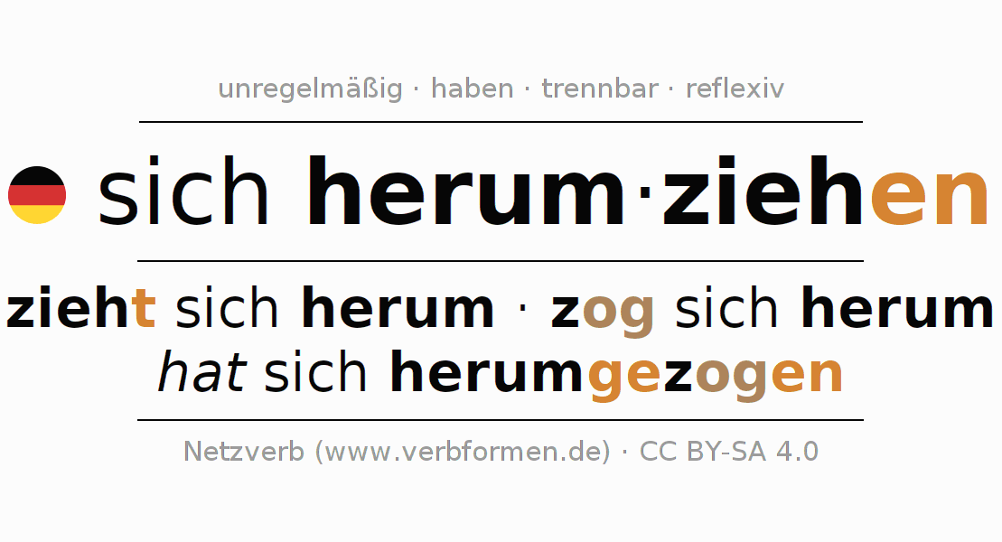 Die Verbtabellen fassen alle Verbformen des Verbs sich herumziehen übersichtlich in einer Tabelle zusammen.