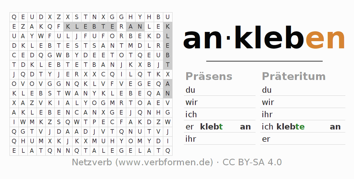 Anleitung: Verbformen des Verbs ankleben bilden und im Rätsel wiederfinden oder gebeugte Form von ankleben im Buchstabensalat erkennen und der richtigen Verbform zuordnen. Umlaute und ß sind als oe, ae und ue sowie ss umschrieben. Die Lösung befindet sich am Ende der Seite.