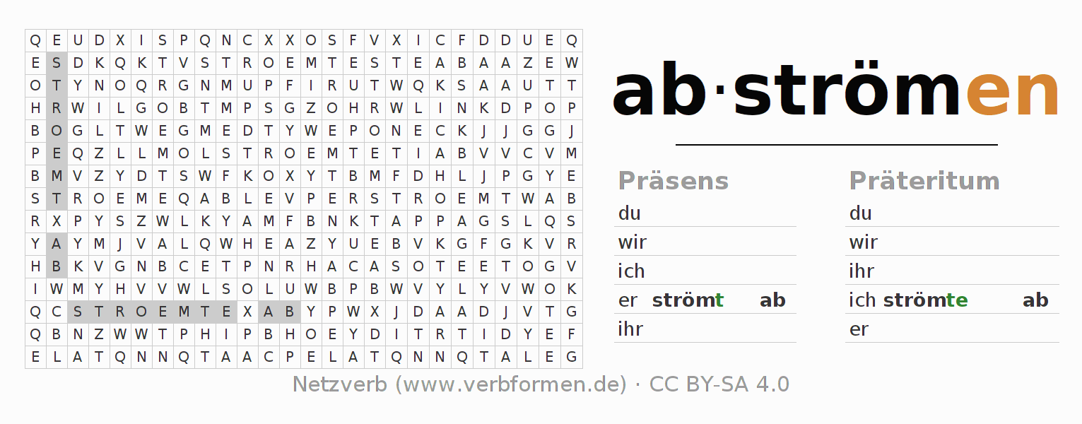 Anleitung: Verbformen des Verbs abströmen bilden und im Rätsel wiederfinden oder gebeugte Form von abströmen im Buchstabensalat erkennen und der richtigen Verbform zuordnen. Umlaute und ß sind als oe, ae und ue sowie ss umschrieben. Die Lösung befindet sich am Ende der Seite.