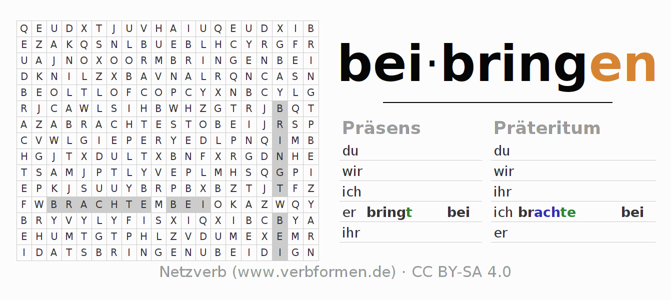 Anleitung: Verbformen des Verbs beibringen bilden und im Rätsel wiederfinden oder gebeugte Form von beibringen im Buchstabensalat erkennen und der richtigen Verbform zuordnen. Umlaute und ß sind als oe, ae und ue sowie ss umschrieben. Die Lösung befindet sich am Ende der Seite.