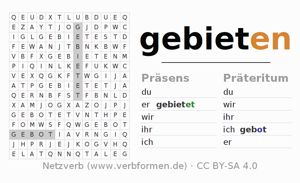 Anleitung: Verbformen des Verbs gebieten bilden und im Rätsel wiederfinden oder gebeugte Form von gebieten im Buchstabensalat erkennen und der richtigen Verbform zuordnen. Umlaute und ß sind als oe, ae und ue sowie ss umschrieben. Die Lösung befindet sich am Ende der Seite.