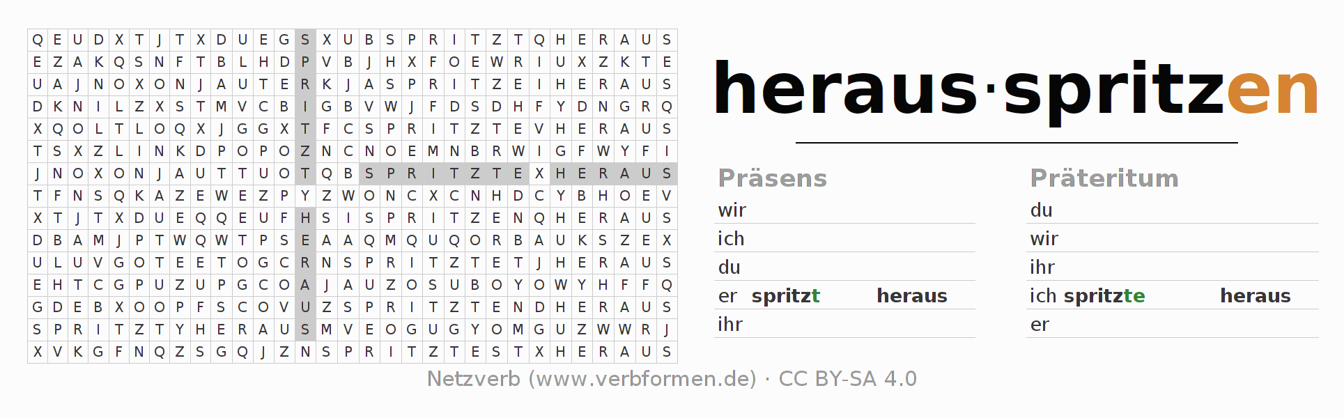 Anleitung: Verbformen des Verbs herausspritzen bilden und im Rätsel wiederfinden oder gebeugte Form von herausspritzen im Buchstabensalat erkennen und der richtigen Verbform zuordnen. Umlaute und ß sind als oe, ae und ue sowie ss umschrieben. Die Lösung befindet sich am Ende der Seite.