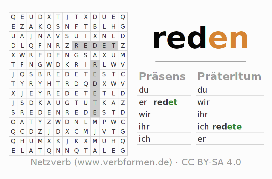 Anleitung: Verbformen des Verbs reden bilden und im Rätsel wiederfinden oder gebeugte Form von reden im Buchstabensalat erkennen und der richtigen Verbform zuordnen. Umlaute und ß sind als oe, ae und ue sowie ss umschrieben. Die Lösung befindet sich am Ende der Seite.