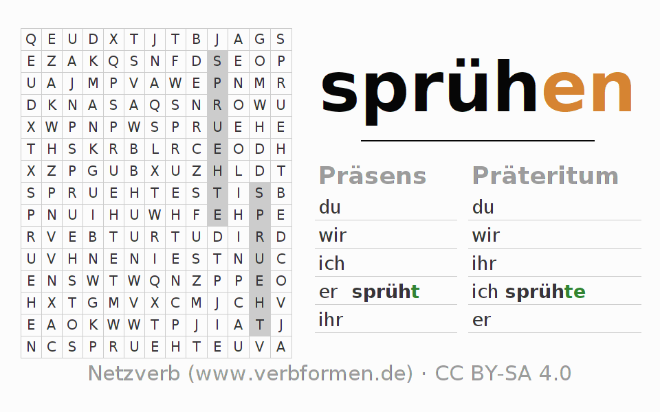 Anleitung: Verbformen des Verbs sprühen bilden und im Rätsel wiederfinden oder gebeugte Form von sprühen im Buchstabensalat erkennen und der richtigen Verbform zuordnen. Umlaute und ß sind als oe, ae und ue sowie ss umschrieben. Die Lösung befindet sich am Ende der Seite.