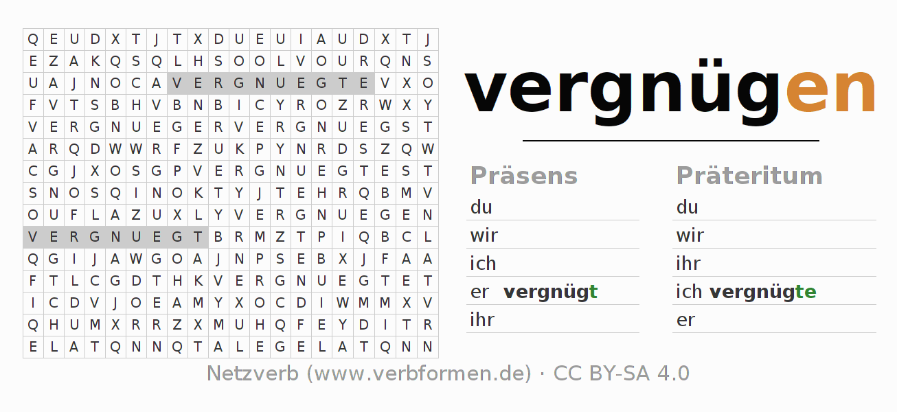 Anleitung: Verbformen des Verbs vergnügen bilden und im Rätsel wiederfinden oder gebeugte Form von vergnügen im Buchstabensalat erkennen und der richtigen Verbform zuordnen. Umlaute und ß sind als oe, ae und ue sowie ss umschrieben. Die Lösung befindet sich am Ende der Seite.