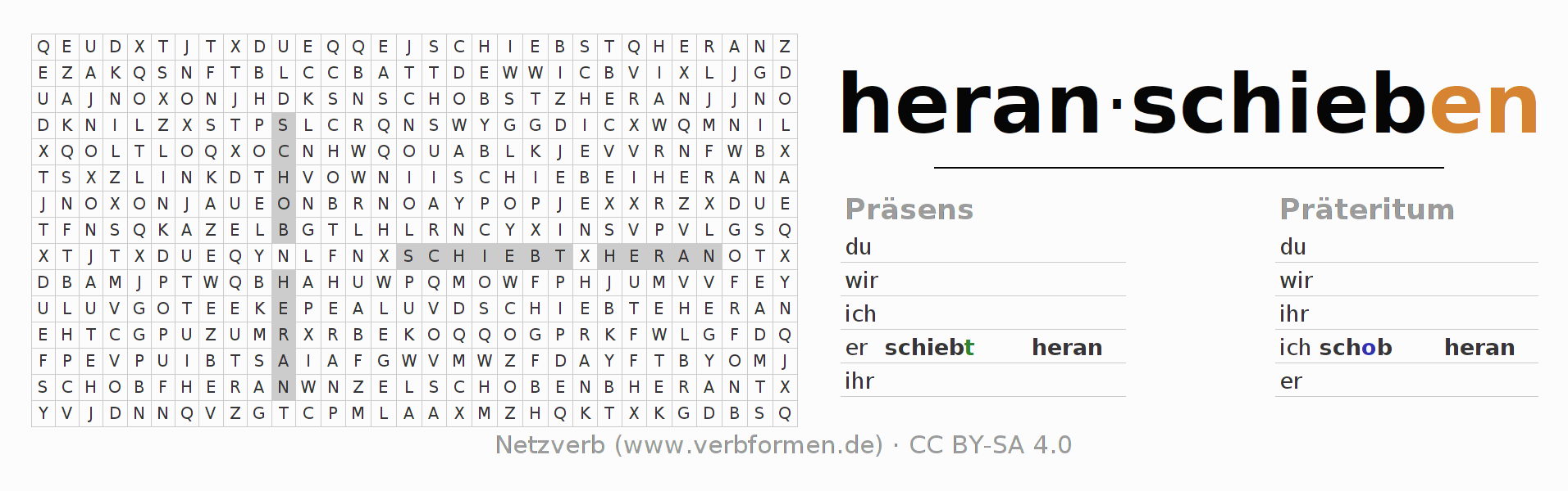 Anleitung: Verbformen des Verbs heranschieben bilden und im Rätsel wiederfinden oder gebeugte Form von heranschieben im Buchstabensalat erkennen und der richtigen Verbform zuordnen. Umlaute und ß sind als oe, ae und ue sowie ss umschrieben. Die Lösung befindet sich am Ende der Seite.